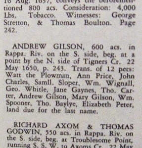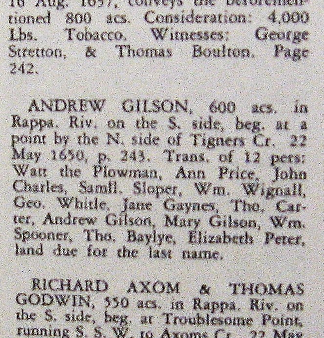 Andrew Gilson patents 600 acres 22 Sunday May 1650 Posted by lewisshepherd in Gilson ≈ Leave a comment 1650, May 22: Andrew Gilson patents 600 acres, at North side of Tigners Creek (later called Gilson’s Creek, now Mount Landing Creek). Share this:TweetShare on TumblrMore Click to share on Reddit (Opens in new window) Reddit