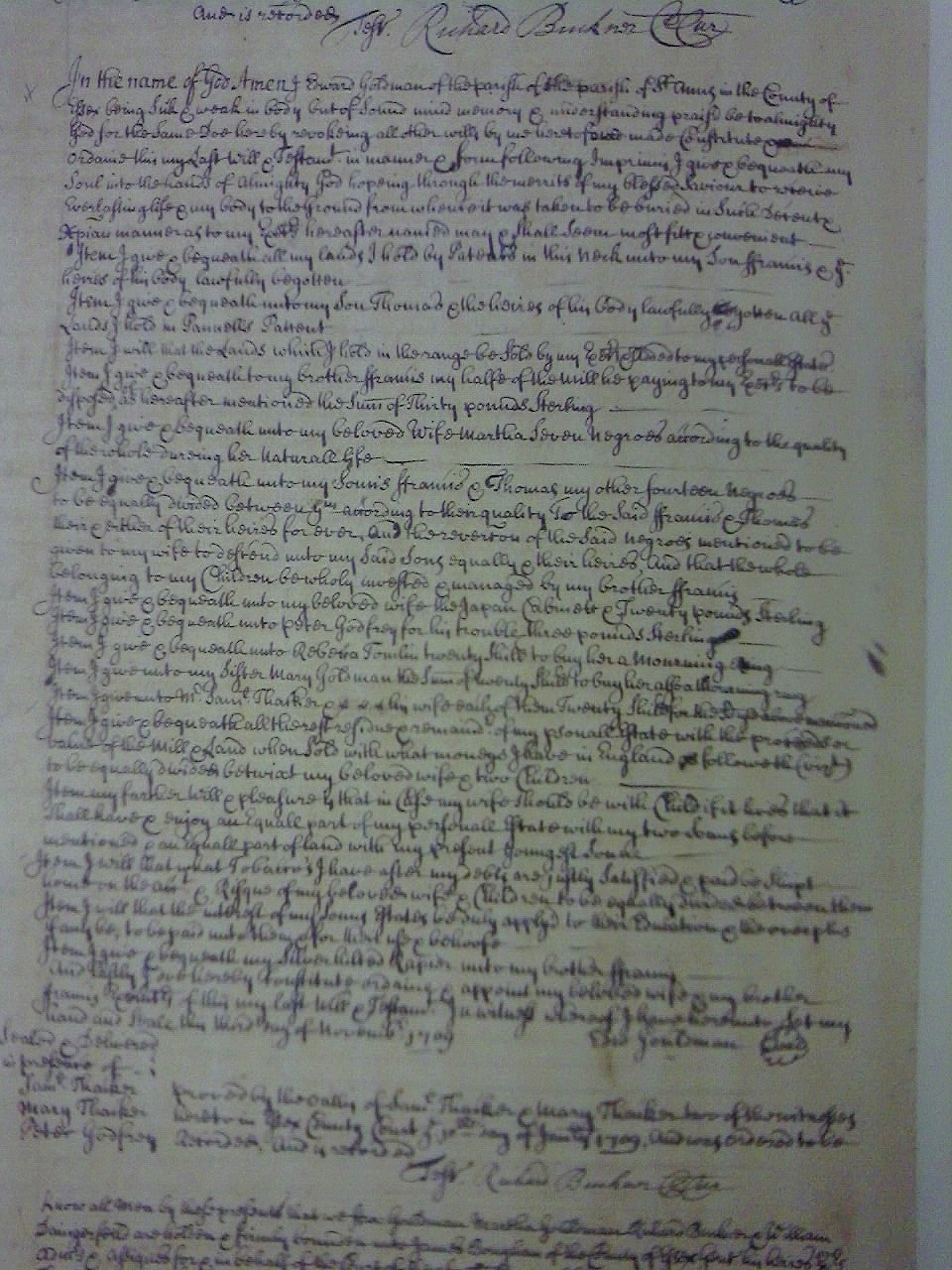 Pages 291-94. “Mr. Edward Gouldman. Inventory. Made in obedience to order of 10 Jan. 1709. Presented to appraisers by Mrs. Martha Gouldman his wife and Mr. Francis Gouldman. No total valuation shown; includes books listed by title, servant woman Elizabeth Clenten, and 21 slaves valued at L 392.10.0.