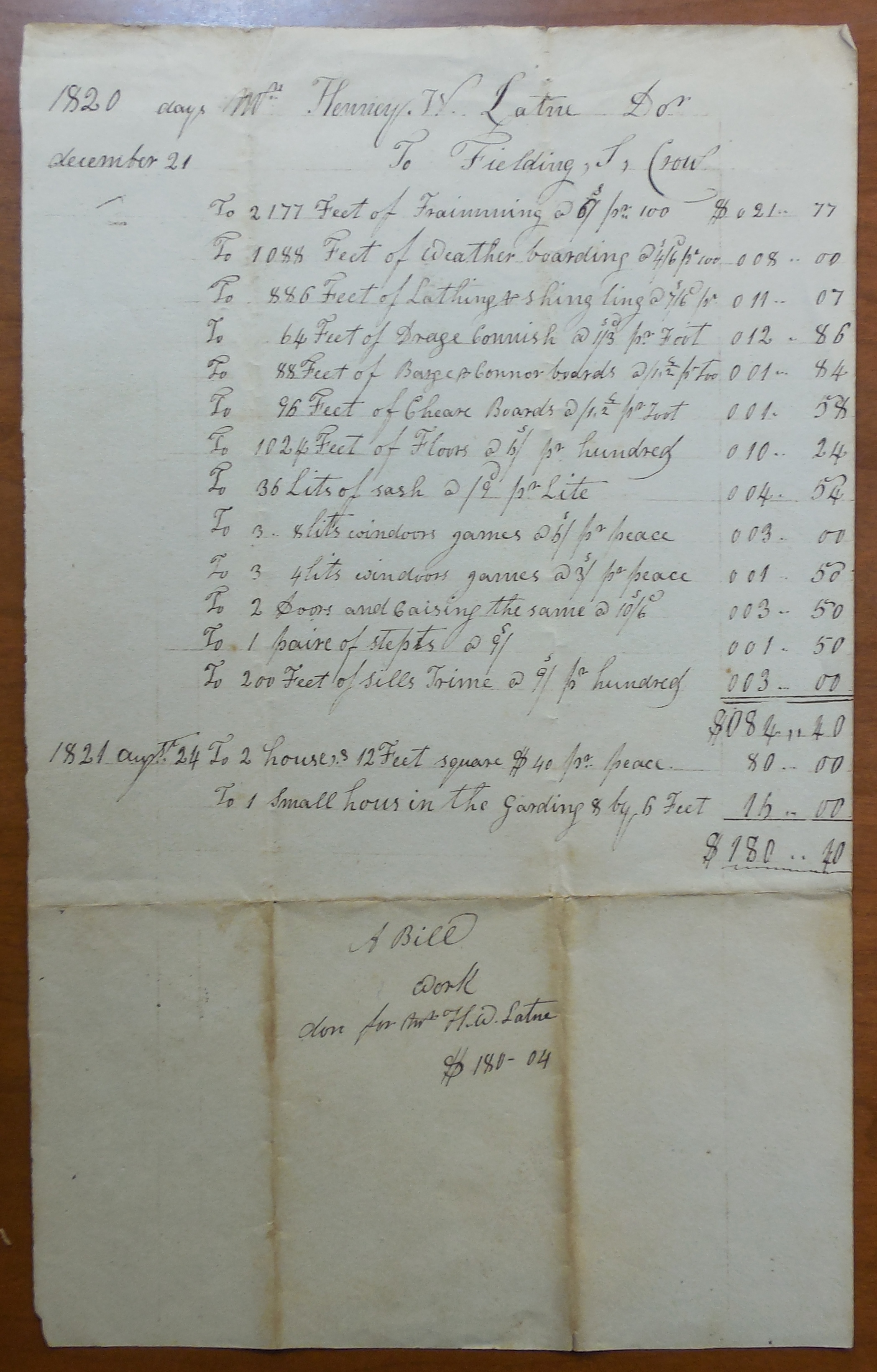 The bill is addressed to Henry W. Latane, born in 1782 and therefore in his late twenties at the time. Henry was the older brother of William Catesby Latane and Thomas Latane; their father William Latane had split up his land among them, with Henry getting one plantation (“The Meadow quarter”) and William Catesby “the Mahockney land.” So in 1820, Henry as the older brother and keeper of the finances (and administrator of the father’s estate) contracted to expand the Mahockney house.