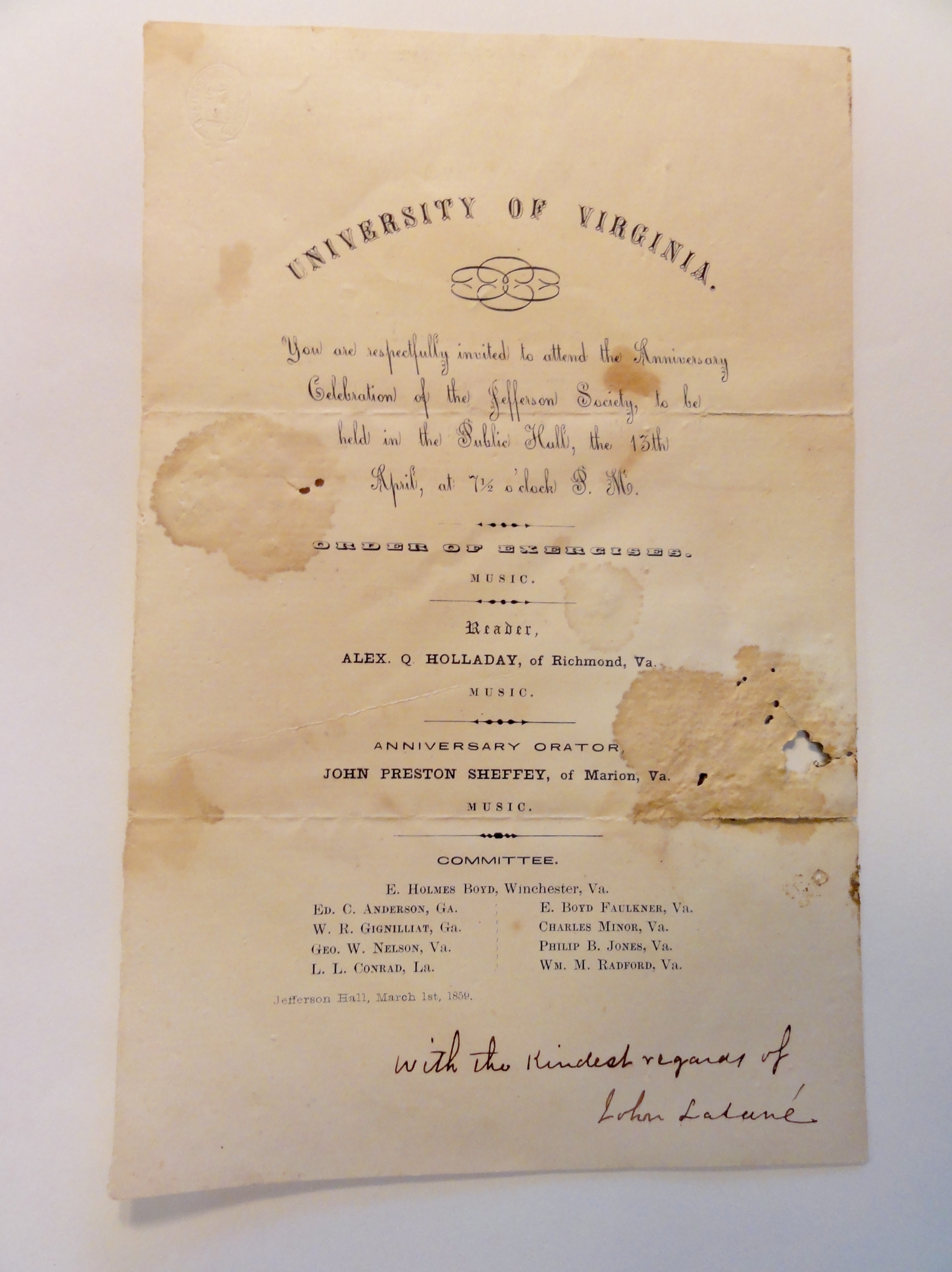 John Latane, born at The Meadows and first-cousin to the Mahockney Latanes, was a University of Virginia student in the run-up to the Civil War. In 1859 he was a member of the Jefferson Literary & Debating Society (as later Mahockney owner Lewis Shepherd was in the 1980s), and young Latane sent an invitation for the Jefferson Society’s annual anniversary celebration for April 13, 1859. From the archives of the Virginia Historical Society.