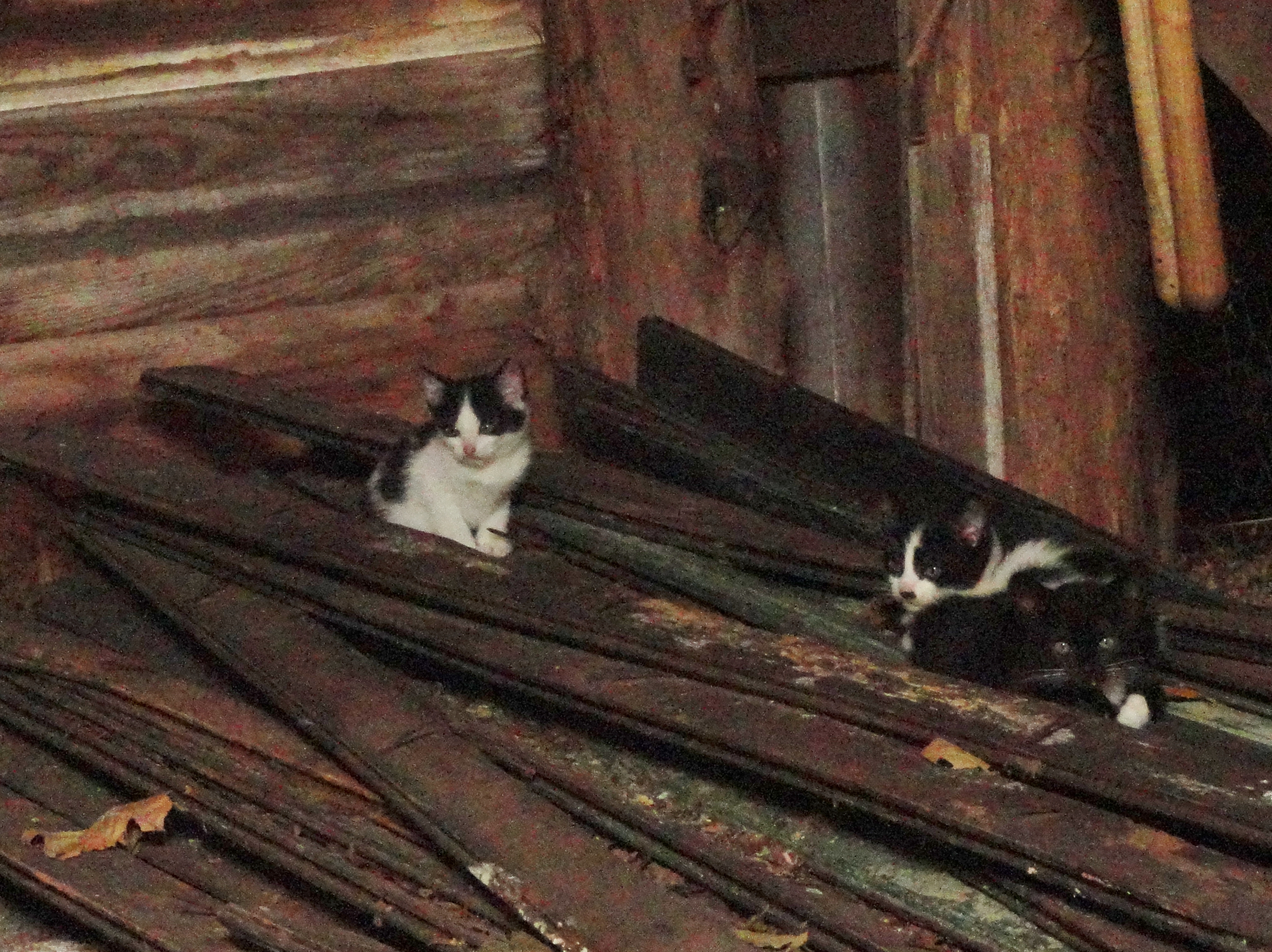 This was discovered when the smallest – nicknamed “Tux” for his black coat and white feet – went berserk and attacked us. Lewis had only a couple of tiny scratches on a finger, with which he had innocently been gesturing “Here, kitty kitty.” Kathryn unfortunately bore alone the brunt of a full frontal assault, when Tux invaded the house, went full-tilt crazy, attacked Rawson the Tibetan Terrier dog, and then lept onto Kathryn’s leg and clamped in a biting death-grip. Only brute force and a massive handbag enabled Kathryn to beat back the beast.