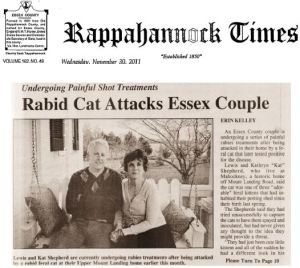 Killer Kitty makes the front page 01 Thursday Dec 2011 Posted by lewisshepherd in Farm, Shepherd ≈ 1 Comment Tagsanimals, cat, feral, rabid, rabies Our local Rappahannock Times published a story on the rabid-cat attack this week. Certain phrases still have me laughing: “antique frog gigger,” “carpetbag,” etc. Ah, good times…. Read the article, “Rabid Cat Attacks Essex Couple” Share this:TweetShare on TumblrMore Click to share on Reddit (Opens in new window) Reddit